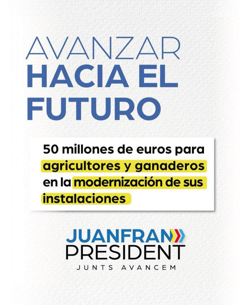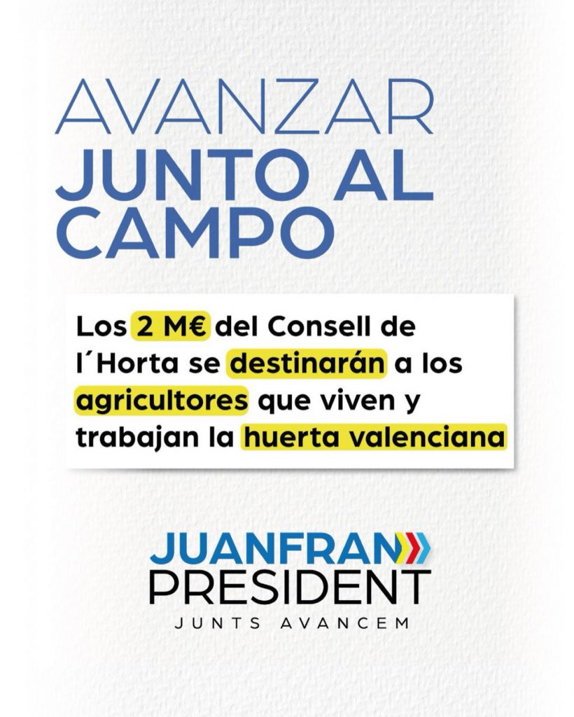 Para el área de agricultura “vamos a destinar el dinero que se gastaba en el Consell de l’Horta directamente para los agricultores. Más de 2 M€, para que el dinero llegue realmente a los que viven y trabajan la huerta”. Además, el aspirante a jefe del Consell ha anunciado una convocatoria de más de 50 millones de euros para agricultores y ganaderos para modernizar sus instalaciones y también la eliminación del Impuesto de Transmisiones Patrimoniales para la compra de animales para ganadería extensiva.