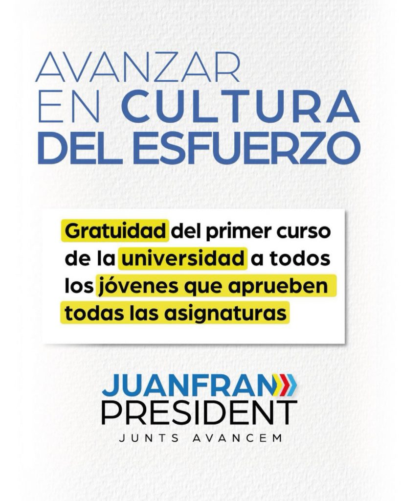 Juanfran Pérez Llorca ha informado que su primera medida “irá encaminada a todos esos jóvenes que quieren crecer, que quieren progresar y que quieren una vida mejor” Por ello “el Consell que aspiro a presidir garantizará la gratuidad del primer curso de universidad, con efectos inmediatos, para todos aquellos jóvenes que aprueben todas las asignaturas”. Porque, según ha insistido, “el desarrollo del talento no debe depender del código postal, del salario de tus padres o de cuántas horas extra pueda hacer tu familia”.